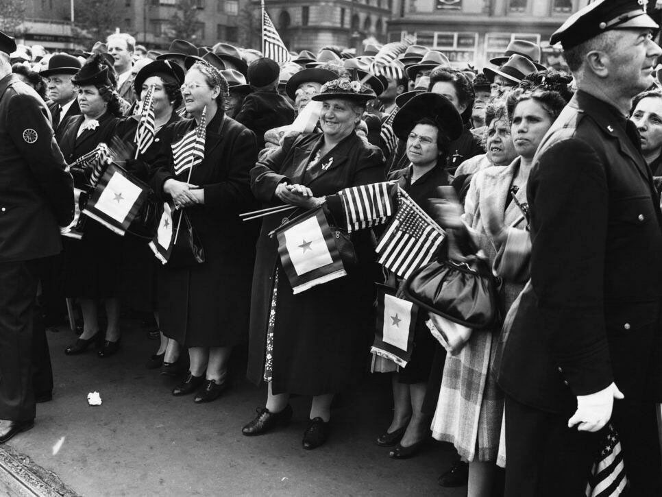 The original BSS banner (approximately 8.5 by 14 inches) was red with a white field to accommodate as many as five blue stars vertically (representing five in service). Expanding on the BSS banner philosophy, President Thomas Woodrow Wilson in 1918 endorsed a request from the Women’s Committee of the Council of National Defense whereby mothers who lost a child in military service during wartime could affix a gold star to their mourning armband .4 This led to a smaller gold star being placed on the highest blue star of the BSS banner. BSS Mothers and Gold Star Mothers (GS) formed veterans’ service organizations .5
