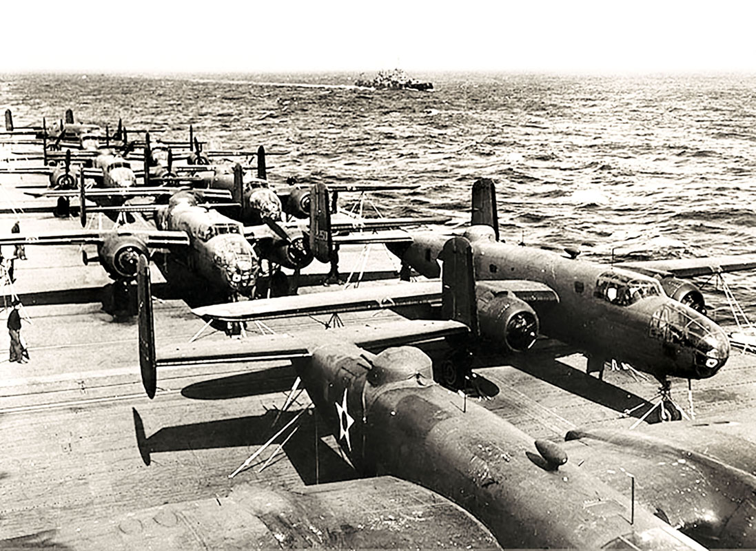 Sixteen U.S. Army Air Corps B-25B Mitchell medium bombers flew off the aircraft carrier USS Hornet to attack Japan on 18 April 1942.