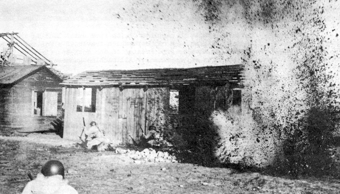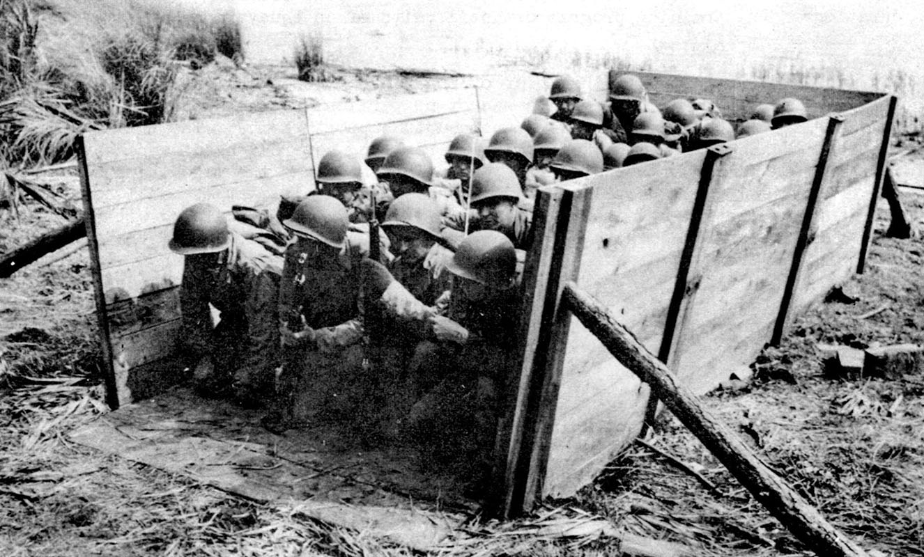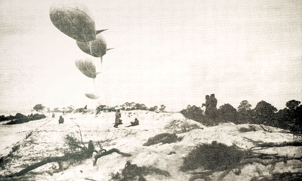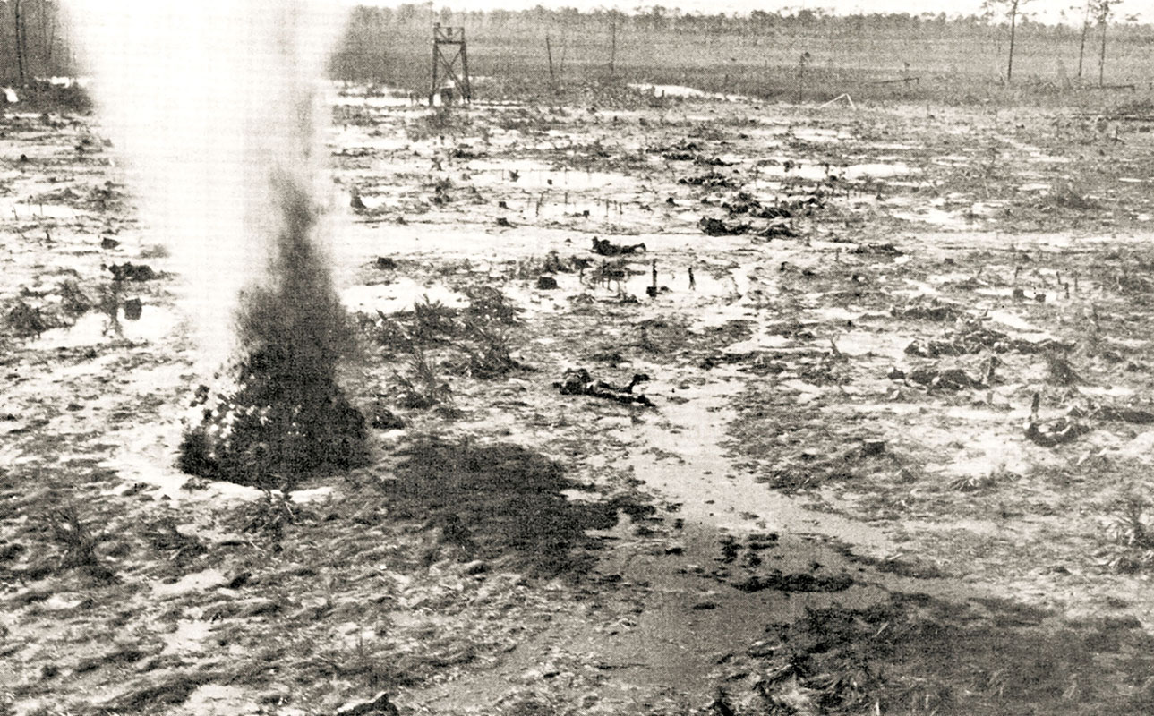 This aerial view of the Camp Johnston infiltration course shows how soldiers were ‘inoculated’ to the realities of combat, crawling a hundred meters amid explosions, smoke, and machinegun fire thirty inches above the ground.