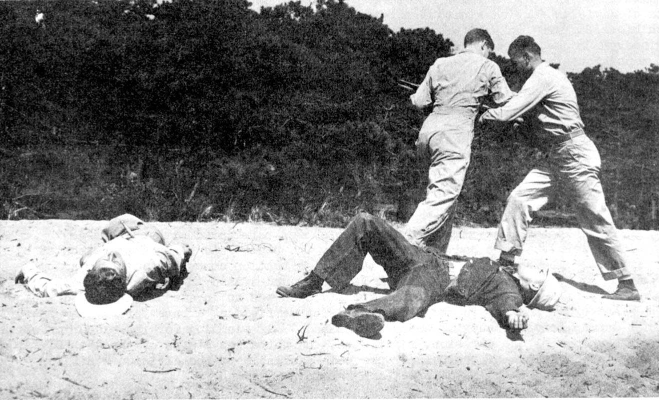 Instruction was done in the field on adjacent obstacle, grenade, and bayonet courses. A Commando Efficiency Course was routed through the woods. It was a lot like Immediate Action courses today. Instructors ingeniously created and staged pop-up, swinging, and drop-down dummies with bladders of pig’s blood that exploded when impaled with a bayonet. Explosive booby traps, trenches, various wire obstacles, and smoke were interspersed. Everyone competed against the clock. ‘Commandos’ were trained quite well ‘on the cheap.’24