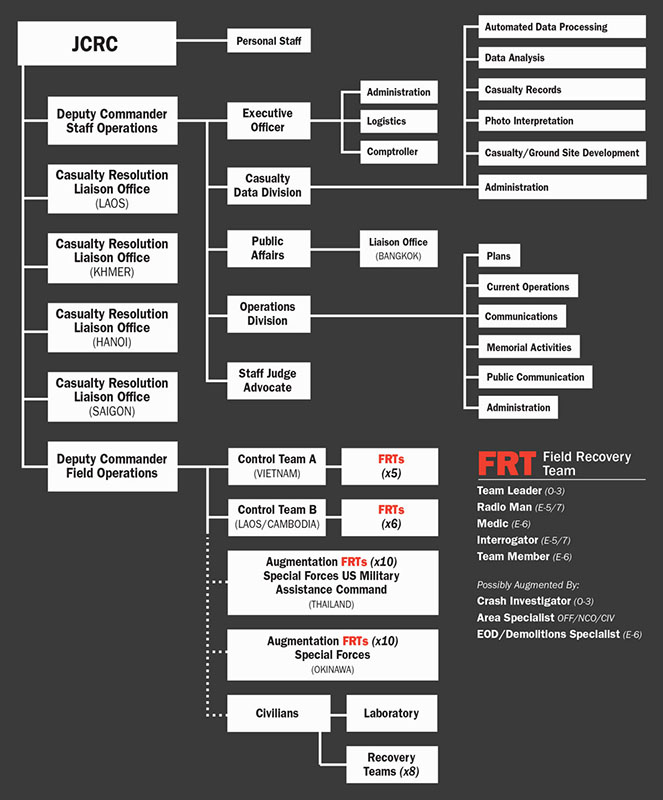 JPRC, formed 17 September 1966 by MACV, was assigned to SOG. Its mission was to coordinate the rescue of imprisoned, detained, escaped, and evading U.S. military and civilians and allied troops when air and ground search and rescue (SAR) efforts were ended in South and North Vietnam, Laos, Cambodia, and Thailand.9 JPRC collected MIA information because the Communists would not identify the American POWs. “The ad hoc approach to formalization of the process in the early years was at best a patchwork fix for what became the most emotional aspect of the war,” recalled Colonel (COL) William H. Jordan.10 Two weeks before MACV disbanded SOG (April 1972), the ten assigned JPRC personnel and their MIA records were transferred to the Director of Intelligence, J-2.11 As U.S. military units began withdrawing from South Vietnam, five people in the Joint Graves Registration Office, Saigon were assigned to JPRC.12 At the end of November 1972, JPRC (now up to sixty personnel) was provisionally called JCRC. Former emphasis on those possibly alive shifted to the dead after the POWs were released.13 Less than a month later, PACOM authorized 110 personnel to raise the number of field recovery teams (FRT)* to eleven.14 By then, recruiting was going ‘full bore’ in Saigon.