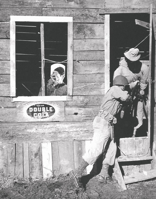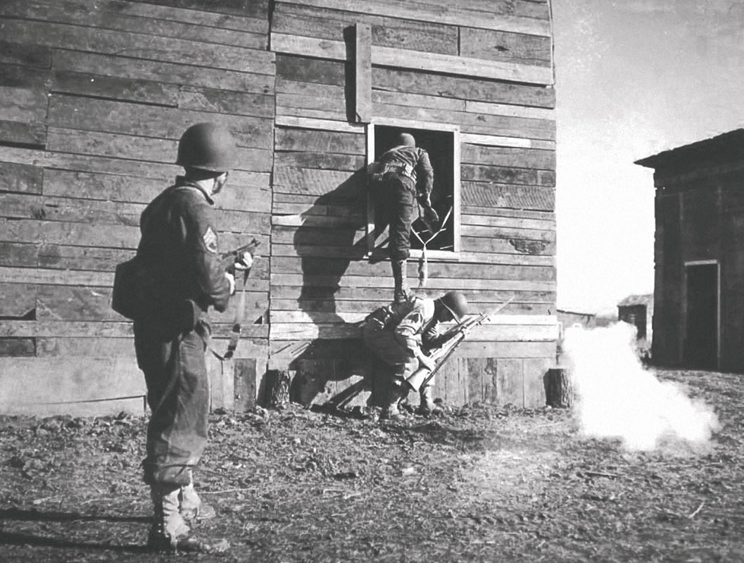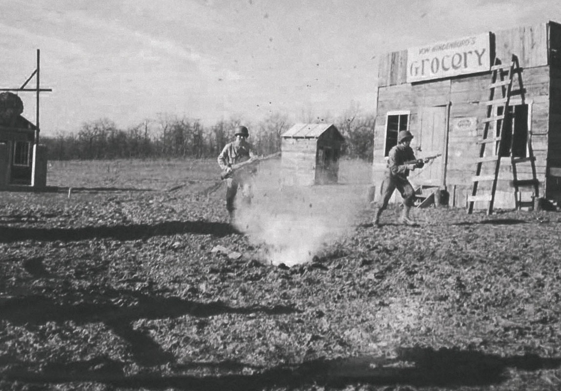 Days started and ended with speed marches. Squads of ‘Rangers’ did ambushes, patrols, stream crossings, and urban street fighting day and night. Though the swimming and small boat practice in Commando training was absent, it was realistic, demanding tactical training ‘on the cheap.’ The German ‘village’ consisted of building facades—basic mock-ups with open windows and doors and simple indoor stairs to second levels. To add realism the mines, booby traps, and explosive devices were makeshift, field expedients built with TNT and dynamite. The ‘Rangers’ who completed the course were to epitomize the creed of ‘Rangerism’—tougher and nastier than the enemy—and were made responsible for spreading that mindset in their units.19