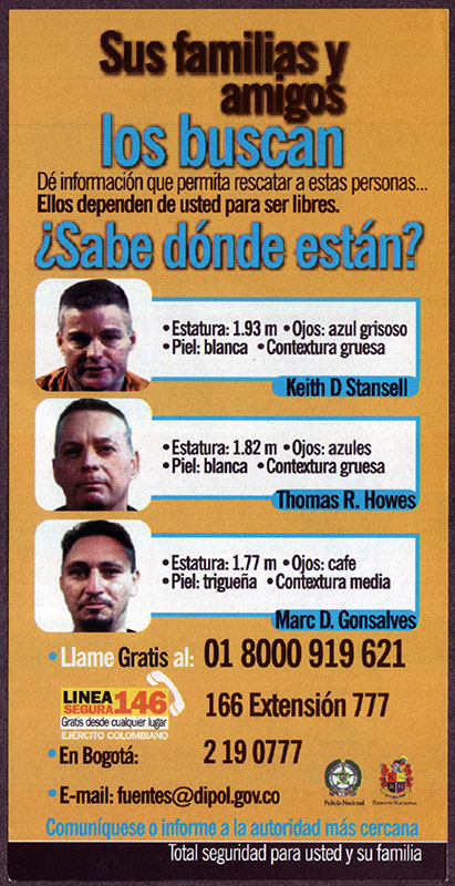 The plight of three Americans held captive in the jungles of Colombia became obscured by the start of Operation IRAQI FREEEDOM (OIF) in 2003, while Operation ENDURING FREEDOM (OEF) continued in Afghanistan and the Philippines (OEF-P).13 In addition, the SOUTHCOM headquarters in Miami was heavily engaged with stability operations in Haiti, and the SOCSOUTH headquarters was departing Puerto Rico for Homestead Air Reserve Base in Florida. Officially, SOCSOUTH could only saturate FARC-controlled areas with ‘Rewards for Justice’ leaflets seeking information on the status of the three Americans. The Department of Justice and the U.S. ambassador approved the messaging on these leaflets. ‘Proof-of-life’ was finally received in July 2003. Colombian journalist Jorgé Enrique Botero videotaped his interviews with the captured Americans and former Senator Ingrid Betancourt Pulecio and her campaign manager/vice presidential running mate, Clara Leticia Rojas González. The latter two had been seized on 23 February 2002 while campaigning for the presidency in the Switzerland-sized demilitarized zone of Colombia called FARC-landia.14