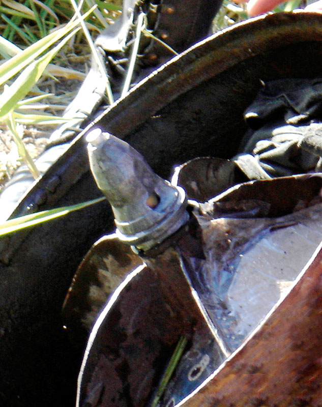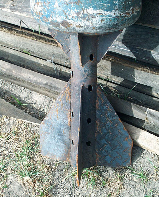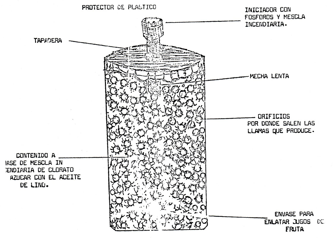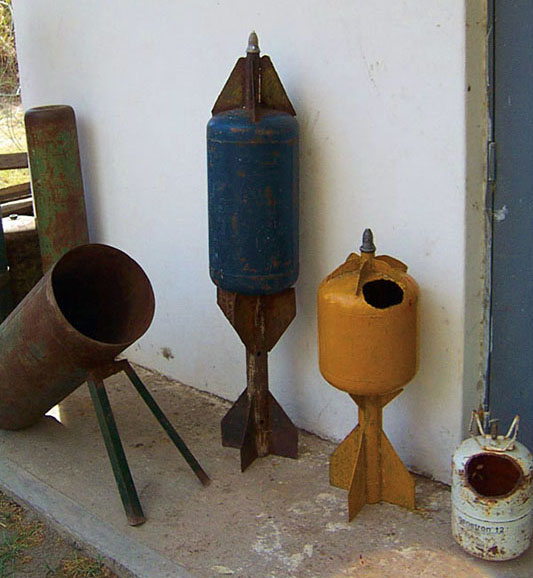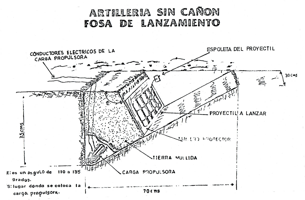 La bomba barbacoa and its launcher are crude, but ingeniously simple. The projectiles are made from common twenty-pound propane gas cylinders. Millions of Colombians use propane gas for cooking and heating, making the supply of tanks plentiful and easily available. The larger hundred-pound tanks serve as the mortar/launcher after their tops have been cut off and a supporting bipod welded on. Crude sheet iron fins are welded to the smaller twenty-pound tank tops to provide some stability in flight (see photos). Through a hole cut in the top or bottom, up to twelve pounds of homemade explosive are poured in and cushioned with sawdust. Sometimes gasoline and glue are added to make them more inflammatory. Tear gas powder is another option. They are time-fuzed with non-electric detonators to land before exploding. A wadded-up burlap sack in the mortar tube (hundred-pound propane tank) separates the propellant black powder from the base of the bomba barbacoa. Electrical detonators fire the propulsion charge and activate the time fuse in the projectile.12