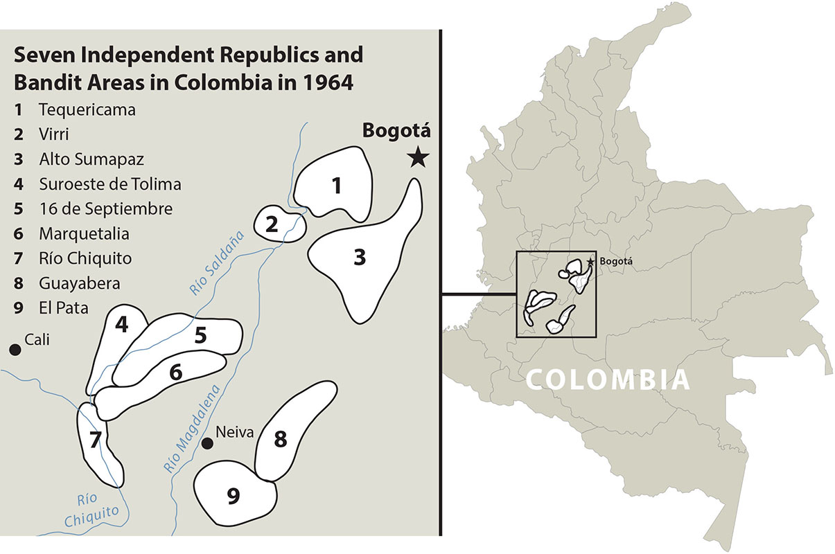 Two months later, Marín and other quasi-guerrilla and bandit groups from the Tolima-Cauca-Huila border areas gathered for the First Southern Guerrilla Conference. After declaring themselves to be “victims of the policy of fire and sword proclaimed and carried out by the oligarchic usurpers of power,” the new coalition called for an “armed revolutionary struggle to win power.” Composed originally of both communist and noncommunist quasi-guerrilla and bandit groups, this southern guerrilla bloc, with some financial assistance, but more ideological support from the Colombian Communist Party, consolidated its armed elements into a unified group called the Revolutionary Armed Forces of Colombia [Fuerzas Armadas Revolucionarias de Colombia (FARC)].24