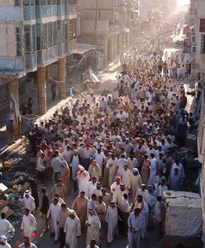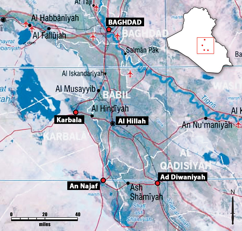 An Najaf, one of the holiest Shia Islam cities in Iraq, is the center of Shia political power. It is located about forty-five miles south southeast of Karbala and hundred miles directly south of Baghdad. The population has increased significantly since 2003 (585,600 people) with the influx of immigrants coming from abroad. As the city containing the tomb and shrine of Imam Ali, the cousin and son-in-law of the prophet Mohammed, whom the Shia consider to be the righteous caliph and first imam, it attracts a tremendous number of Shiite Muslims from around the world every January before Ashura. Adjacent to the shrine of Imam Ali is possibly the largest Muslim cemetery in the world. Only Mecca and Medina in Saudi Arabia host larger Muslim pilgrimages.2