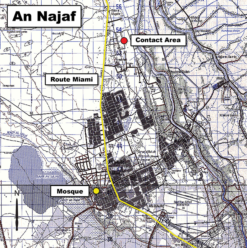 Map of An Najaf showing the relationship of the Imam Ali mosque and Route Miami (Karbala/An Najaf highway) to the initial contact site.