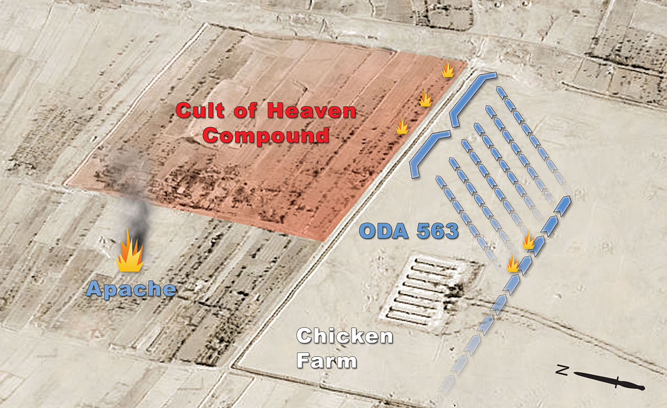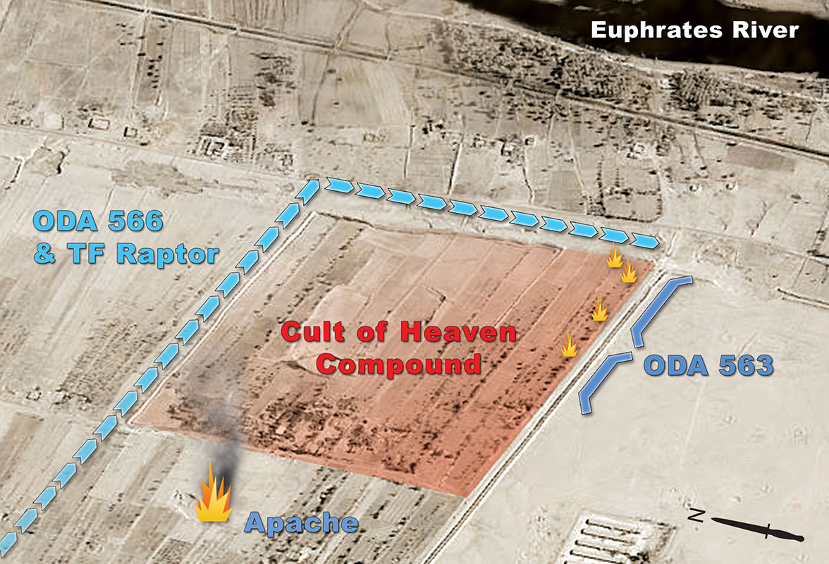Section of imagery map showing Phase Two depicts ODA 563 and Hilla SWAT doing a vehicle half-left echelon assault on enemy forces firing from the compound berm.