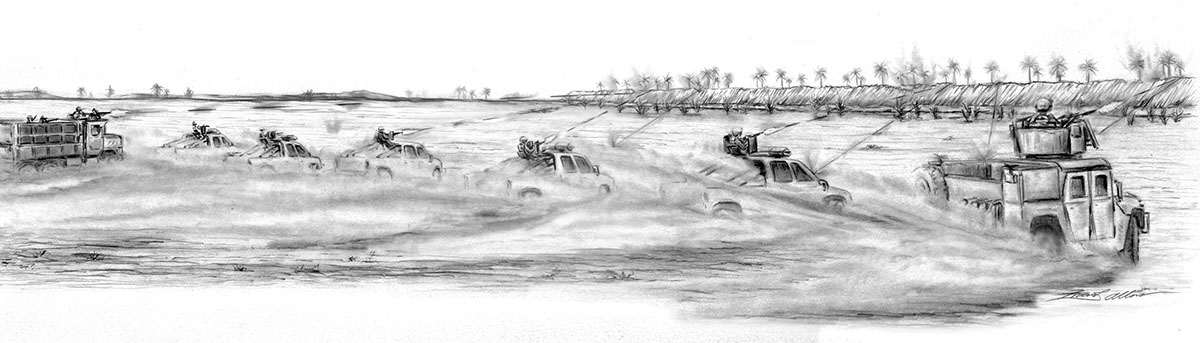 Artist rendition of the 28 January 2007 vehicle-supported assault by ODA 566 and TF Raptor to drive the enemy back from the compound berm allowing trapped Iraqi government officials, police, and Army Scouts to reach safety.