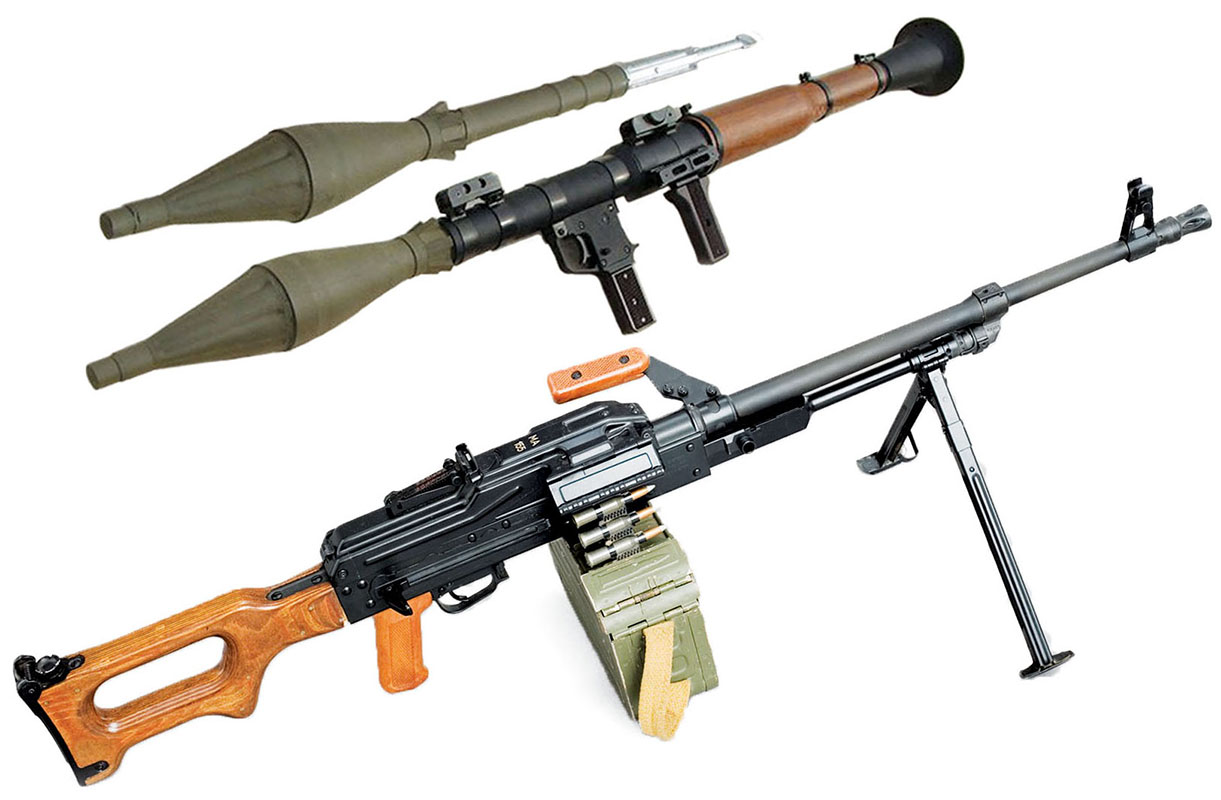 The 7.62mm PKM light machinegun and a rocket-propelled anti-tank grenade (RPG), with its launcher.