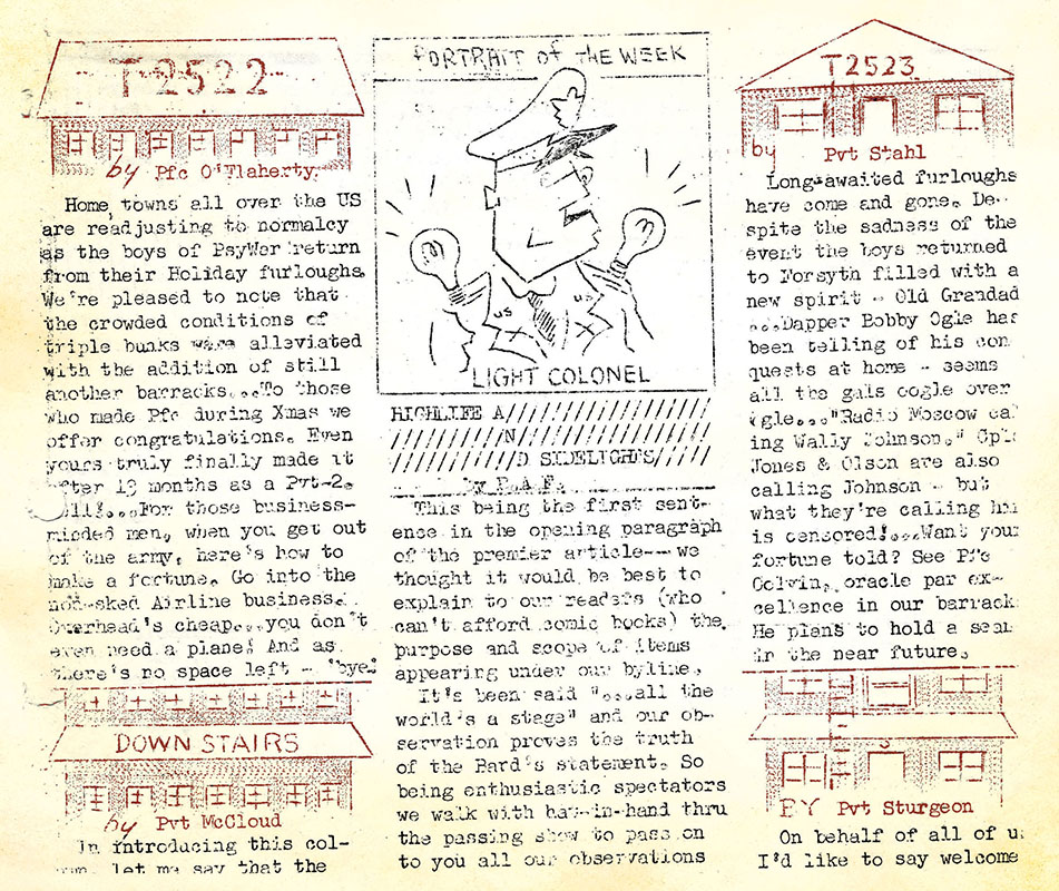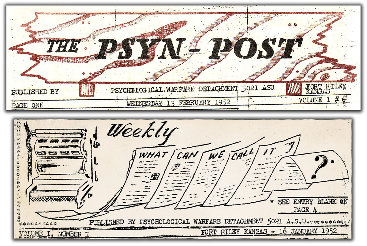 The purpose of this article is to show how The Psyn-post, first published on 16 January 1952 by the 5021st Psychological Warfare Detachment A.S.U. (Army Special Unit indicated provisional status) at Fort Riley, KS as The Weekly, provided a view of the 8th Mobile Radio Broadcasting Company (MRBC), a 6th RB&L unit.5 LTC Frank A. McCulloch, the detachment commander, explained the value of a weekly unit newsletter: “It is the medium whereby we can share bits of fact and humor. In time, it will be the mirror of missions and accomplishments, the weekly reflections of our daily lives and a continuing history of our service to our country.”6