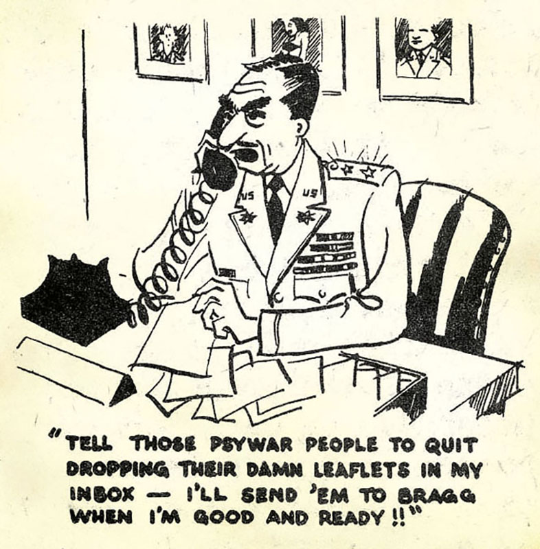 What CPT Durk did not mention was that PFC George Vlandis was the PsyWar Division Instructor Committee chairman for the Enlisted Psywar Course, which required a college degree and a score of 110 or better on the G.E.D. (General Educational Development) tests.10 Ninety percent were college graduates, some with advanced degrees.11 Using faint praise attributed to General Dwight D. Eisenhower to show Psywar’s importance to the Army only emphasized how postwar leaders perceived its usefulness: “Without doubt, Psychological Warfare has proved its right to a place of dignity in our military arsenal.”12 One can better appreciate the uphill battle that BG Robert A. McClure, GEN Eisenhower’s European Chief of Psychological Warfare, fought to revitalize Psywar capabilities in the Army.