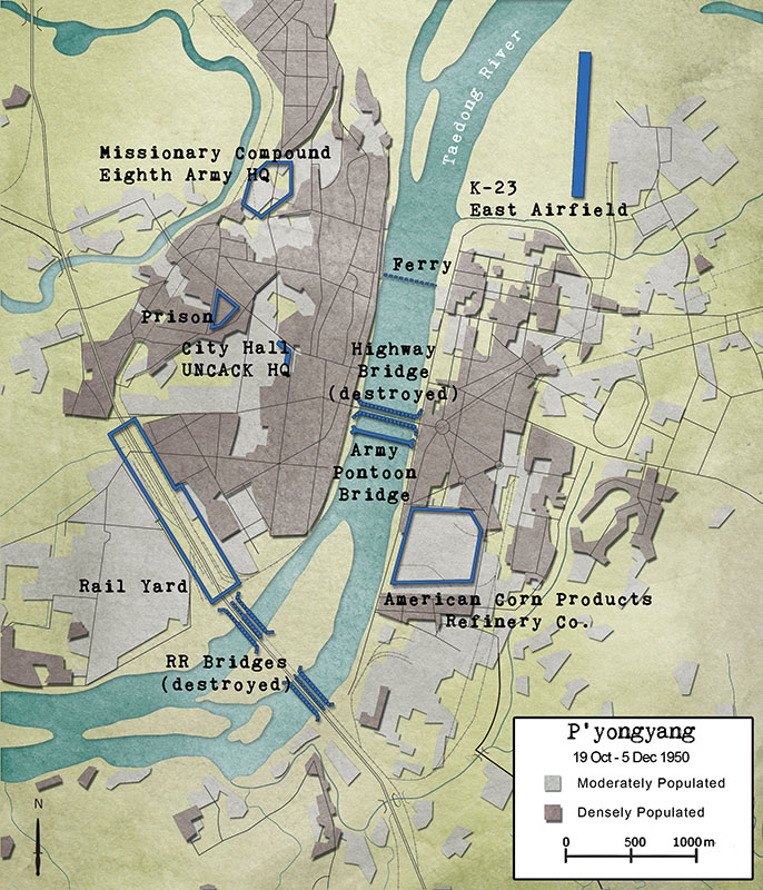 Divided by the Taedong River, the west side of P’yongyang contained most of the population, government and municipal buildings, cultural centers, churches, numerous schools, and hotels. The east side of the city was mainly industrial, but a large housing project was nearing completion. Entering the eastern outskirts of the capital, the CA team drove by badly damaged factories. One was the American Corn Products Refinery Company. An American mobile army surgical hospital had already been erected nearby. Near the airfield (designated K-23) on the northeast side of the capital were signs pointing to Division and Corps command posts.10