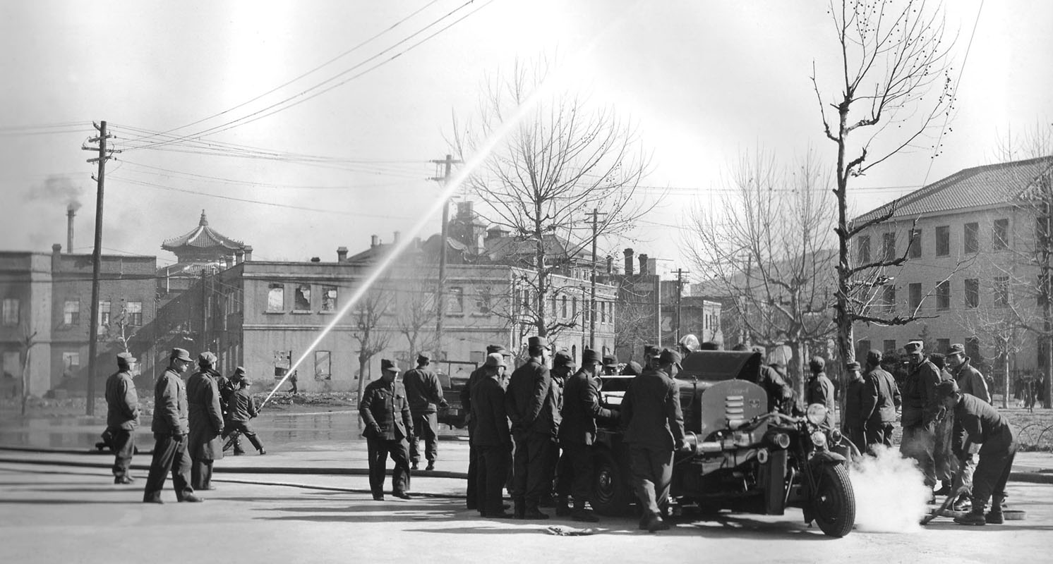 A single working fire “truck” (actually a motorcycle) was available to fight fires in P’yongyang in late 1950. This demonstration of the pumper’s power took place in front of the damaged City Hall, which can be seen in the center background.