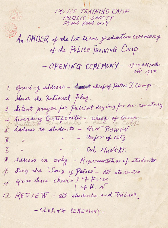 Munske Interim Report; Eighth U.S. Army Korea Civil Assistance Command Public Safety Office, P’yongyang City Police Training Camp, 1st Term Graduation Ceremony, 12 November 1950; Charles R. Munske, letter to his wife, 12 November 1950; Munske Undated Report.[return]