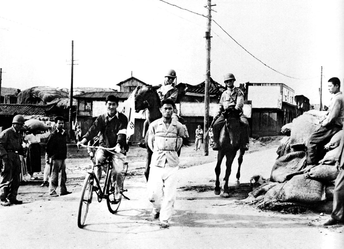 Mounted South Korean soldiers “ride herd” on a prisoner as he is marched through a P’yongyang street to a prisoner-collection point. A bicycling North Korean citizen, wearing an armband that identifies him as an anti-Communist, joined the parade.