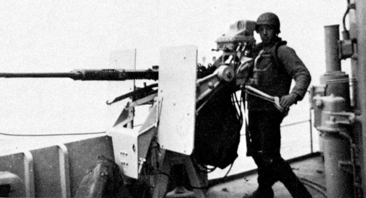 Slated for duty with the Pacific Fleet serving off Korea, the Lowry began training exercises in the Caribbean in August 1951 from Guantanamo Bay, Cuba. Seaman Ghiglieri proved to be a crack marksman with the .50 caliber machinegun and was assigned as gunner, starboard bridge station, next to twin 20 mm anti-aircraft cannon. During the Caribbean cruise Ghiglieri won the ship’s logo contest with his sketch of a tiger “jaw-locked” on a torpedo. Lieutenant Commander Arthur C. Jackson, agreed with his chief petty officer that Seaman Ghiglieri’s talent could be put to better use as a combat illustrator rather than as a U.S. Navy machine gunner off Korea.”2