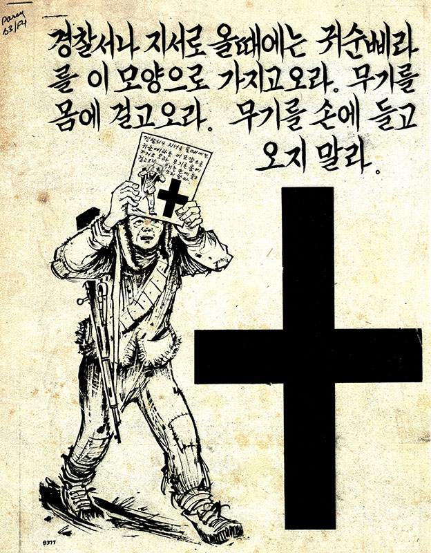 With the UN humanitarian bomb raid warnings the Psywar leaflet and radio themes were able to expand beyond the threat of artillery and naval gunfire barrages. The art staff worked on leaflet designs, while the 3rd Reproduction Company, at the FECOM Publication Center facilities in Motosumiyoshi, mass printed leaflets on Webendorfer Offset and Harris LTV Stream-Fed presses.7 Then, the leaflets were packaged in door bundles for C-47 Skytrain delivery in Korea or loaded as rolls into M129E1/E2 500 lb. leaflet bombs for B-29 squadrons stationed in Japan and B-26 Invader elements on the peninsula. Dates, times, and sites of the FEAF bombing targets were contained in teletype messages to the 4th Mobile Radio Broadcasting Company (MRBC) stations in Korea. The U.S. Army radio officers at each KBS station were responsible for writing and broadcasting humanitarian bomb warnings an hour before the air attacks.