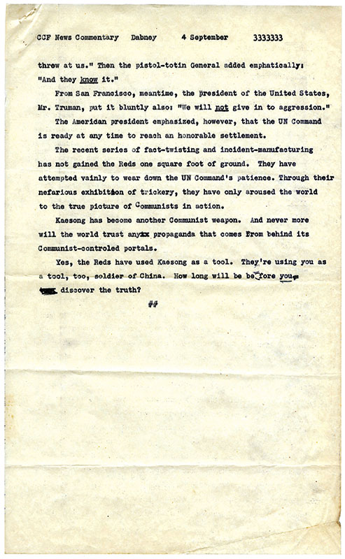 The secondary “umbrella” mission was to be accomplished by airing only official ROK PIO (Public Information Office) releases not blasphemous to the U.S. or UN cause, all official statements from USIS, UNCURK (UN Commission for the Unification and Rehabilitation of Korea), UNCACK (UN Civil Assistance Command, Korea), UN, other UN or State Department agencies, and authenticated news releases not speculative nor editorial in nature if they come from reliable sources and these sources are carefully labeled.25