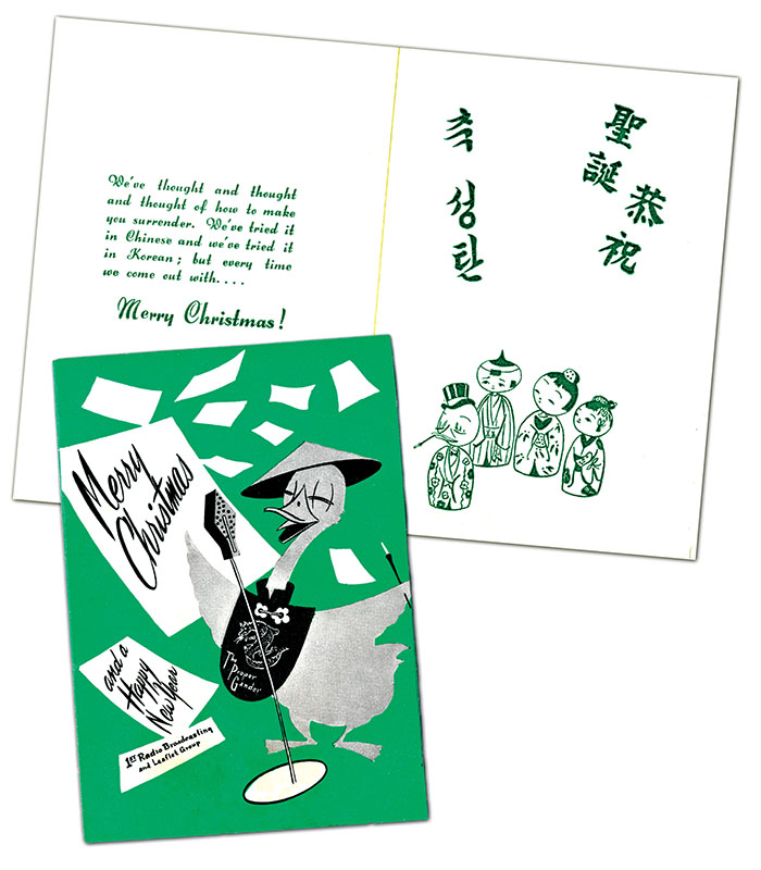 The “Proper Gander” was featured on 1st RB&L Christmas cards designed by the Graphics Section. They sold for a “piddling 3½ cents” when beer cost “a nickel and a high ball sold for a quarter” in Japan. A Christmas card was an easy way to claim credit for writing home.