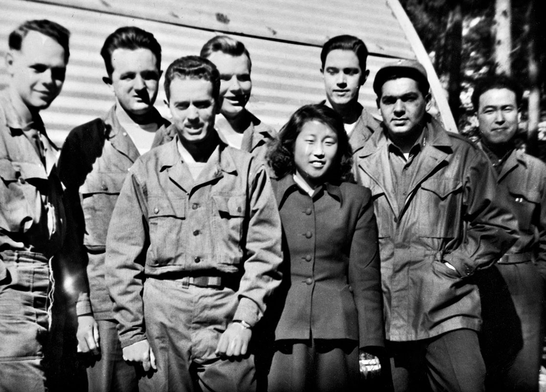 The 4th MRBC Radio Pusan staff in the fall of 1951 (L to R): CPLs William F. Morton, Anthony E. Severino, Joseph E. Dabney and Kenneth V. (Ken) Benson; Korean Secretary, Miss Suh (Suzie); PFC Bradley Duckworth; 2LT Eddie Deerfield; and Mr. Min, the chief Korean translator, a Department of Army Civilian (DAC).